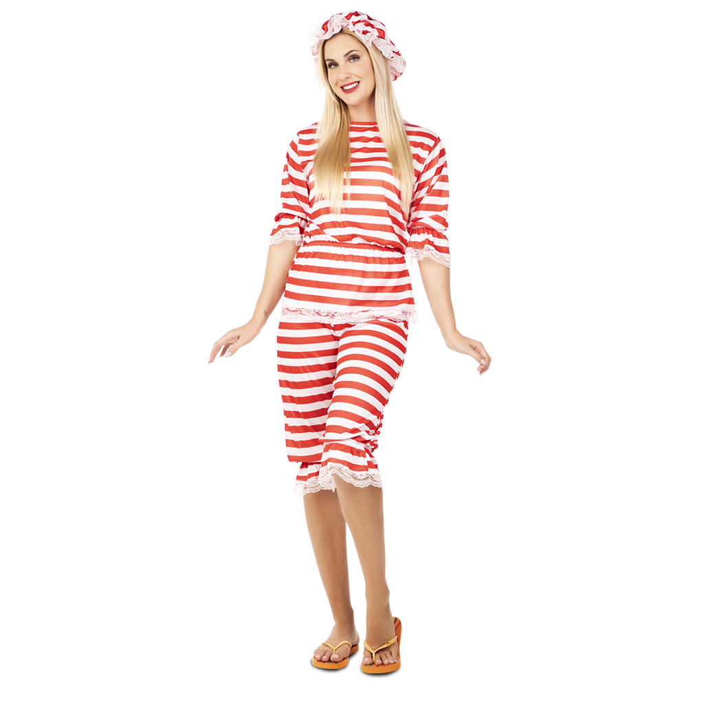 El disfraz de bañista rojo para mujer incluye Gorro y traje. Conjunto de baño de los años 20, un disfraz muy divertido para cualquier fiesta de disfraces.