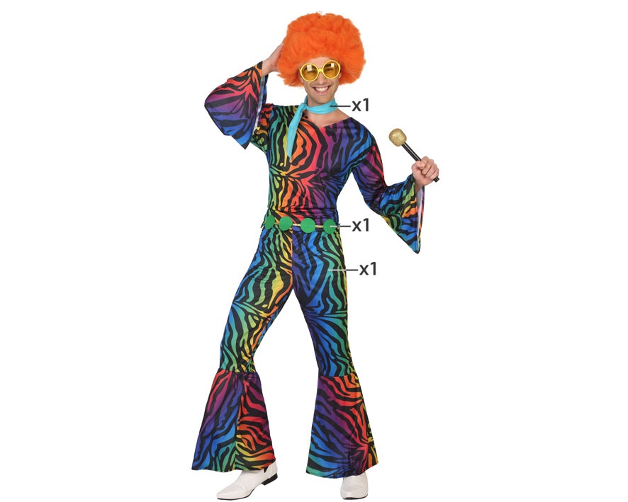 El disfraz de disco rayas para hombre incluye un cinturón, un pañuelo y un mono. Conviértete en el rey de la pista en tu fiesta temática con este original disfraz para hombre.