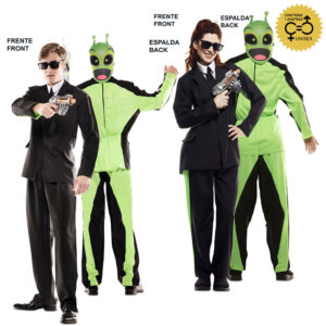 El disfraz doble fun! traje negro unisex para adulto incluye Chaqueta con camisa simulada, pantalón, máscara, gafas. Divertido disfraz double fun que permite convertirte a la vez en un agente Men in Black y extraterrestre.