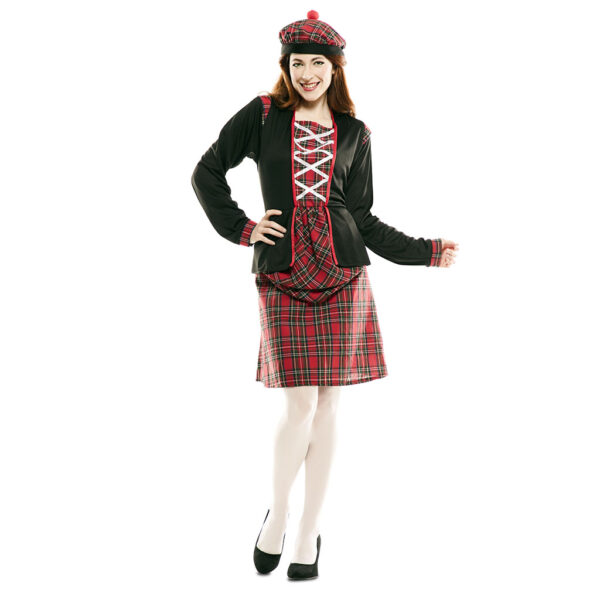 El disfraz de escocesa par mujer incluye vestido, gorro, ligas. Este original y completo Disfraz para chica presenta la estética típica de los trajes típicos de Escocia pero con un toque femenino y muy sensual.