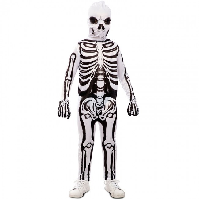El disfraz Halloween de Esqueleto blanco para niños incluye: mono y máscara tela. Este es un traje aterrador de niño imitando a un esqueleto de color blanco.