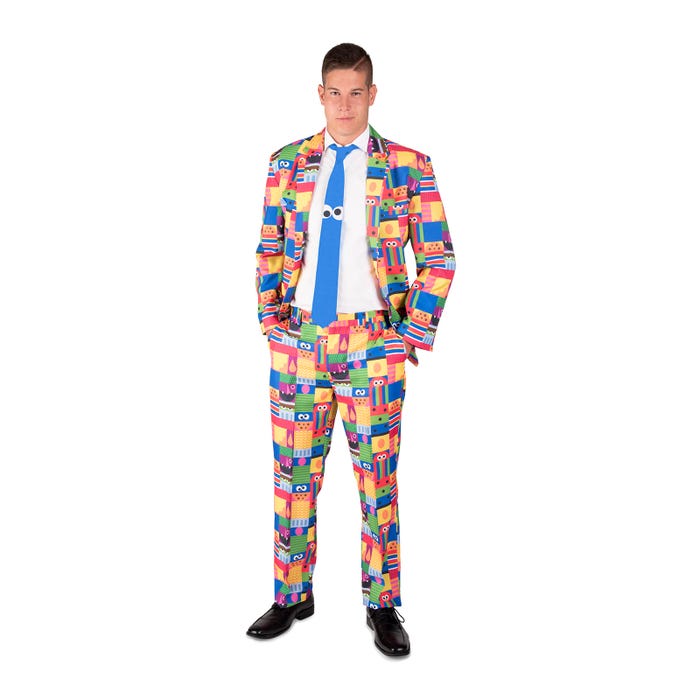 El disfraz traje de Sésamo Street para hombre incluye chaqueta, pantalón y corbata.